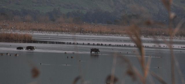 В болоте/пруду, куда перелетали журавли на ночь, были замечены кабаны. Не знаю, какова официальная позиция религиозных инстанций на существование этого зверя в границах земли Израиля, но очевидно этих зверюг она не сильно беспокоит.