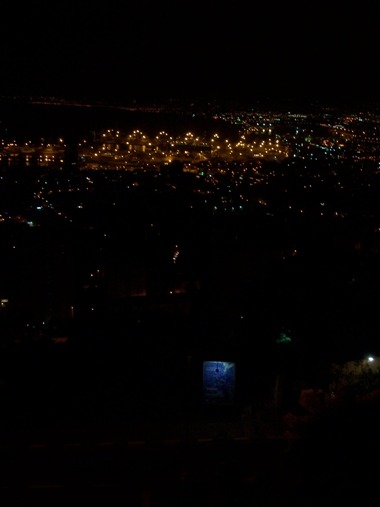 Ночная Хайфа из окна гостиницы со светящимся постером Шагала внизу |