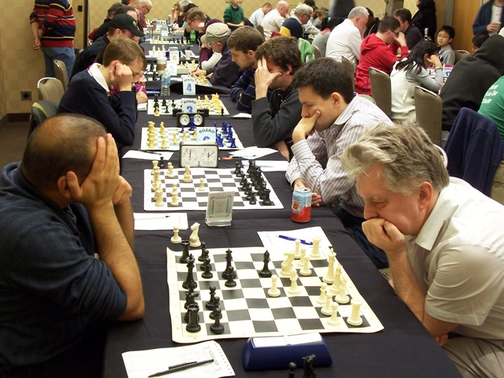 Начальная позиция гамбита Морра. В этой позиции соперник, обхватив голову руками, продумал минут двадцать (вторая доска, чёрные. На первой белыми играет гм. Сергей Кудрин).