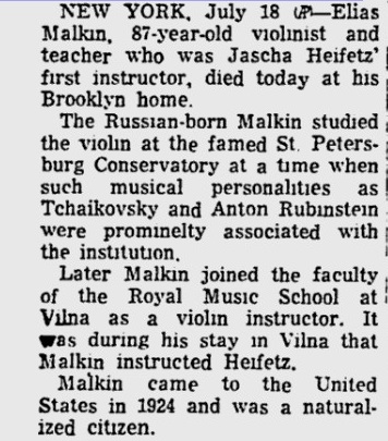Продолжая тему Вильно. В этом городе в 1901-м году родился Яша Хейфец. Его отец, Рувим (Реувен), был скрипачом любителем. Судя по всему, профессиональным скрипачом он был примерно полгода, когда некто Элиас Малкин (Илья Давидович, 1866—1953) пытался организовать в городе еврейский театр и пригласил Рувима на должность концертмейстера небольшого театрального оркестра. Театр продержался всего один сезон, зато Хейфец старший познакомился с Малкиным, который (guess what) тоже был скрипачом. И когда Яша в три года уже уверенно пиликал, его отдали в школу к Малкину. Ниже короткий некролог из газеты Sarasota Herald-Tribune от 19го июля 1953го года