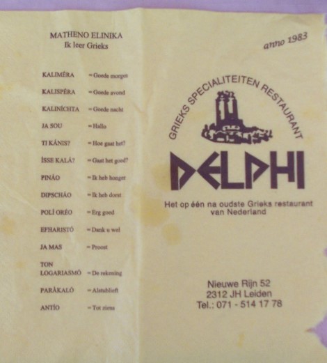 Продолжая мультикультурную тематику, показываю салфетку из греческого ресторана в Лейдене. На салфетке написаны некоторые греческие слова и выражения и их перевод на голландский. Не то, чтобы это нам сильно помогало.