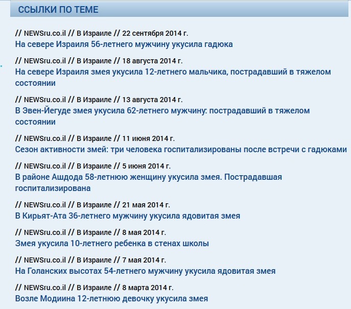 В ночь на 9 октября в больницу "Зив" в Цфате был доставлен мужчина, житель одного и кибуцев в Галилее, который был укушен гадюкой. Врачам удалось стабилизировать состояние пострадавшего, однако, как сообщают из больницы "Зив", он остается в отделении интенсивной терапии, так как его состояние оценивается как критическое. Отметим, что в Израиле ядовитые змеи активны практически круглый год, за исключением нескольких зимних месяцев.
