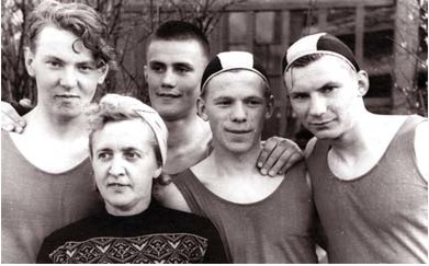 но я не об этом собственно. одним из его друзей-соратников, о котором он среди прочих, много рассказывал, тоже питерцем-блокадником, тоже гребцом, только более успешным-ставшим первым советским олимпийским чемпионом на той хельсинской олимпиаде в 52-м, был тюкалов(тоже юра). тоже совершенно неординарная личность. вот в сети нашел их юношескую (49 года) фотку, где они 4-ро чемпионы ссср в четверке распашной. тюкалов слева крайний, чуть сзади рядом с ним-рогозов.