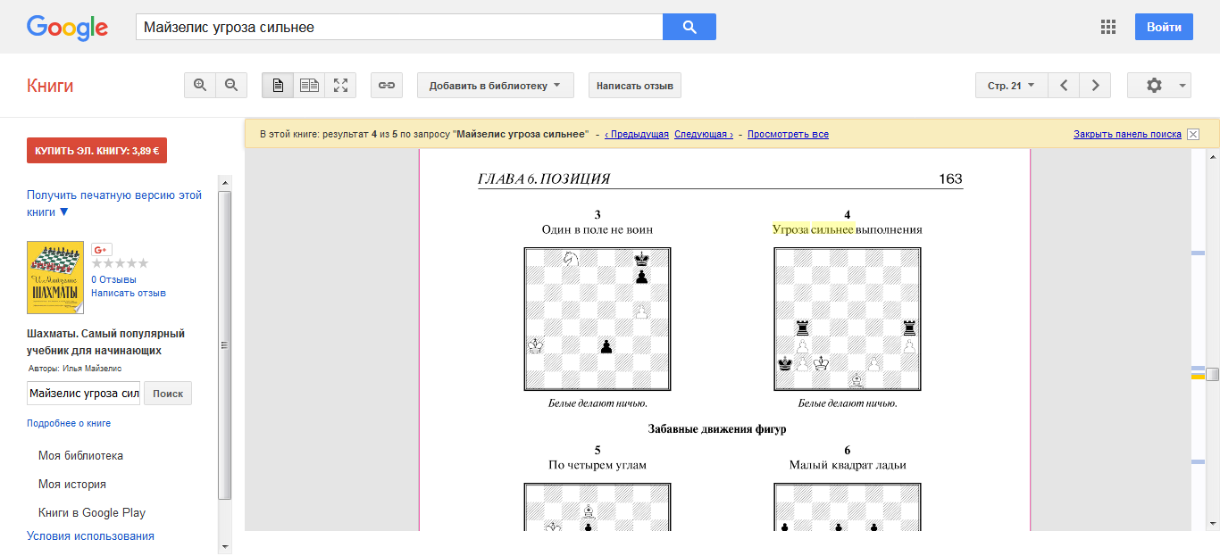 А я и с Майзелисом не согласен. В чем, собственно, состоит угроза белых на приведенной диаграмме? Я вам отвечу за Майзелиса, раз он вводит в искушение доверчивых любителей шахмат. Угроза белых: съесть даром целую ладью, а не глупо разменять на ладью своего единственного слона. И где же, скажите на милость, здесь угроза сильнее ее исполнения? Если эту угрозу осуществить, то проблемы могут начаться уже у черных.