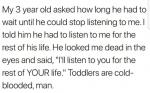 Отличная вещь, психологически точная. Могут быть и комбинации этих двух ситуаций. Скажем, мой брат в возрасте лет трёх сидел за столом и смастерил себе паровоз с вагонами из кусочков сахара. Долго возил их по столу. Потом родственник спросил, указывая на первый кусочек сахара, а что это? Явно ожидая услышать "паровоз". Но брат удивлённо на него посмотрел и сказал: "как что? - кусочек сахара!"
