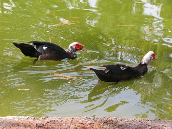 Это мускусные утки, в простонародье индоутки. Они давно одомашнены и выращиваются на мясо и яйца. У меня такие раньше жили. Хорошая птица, в отличие от обычных уток спокойная и тихая.