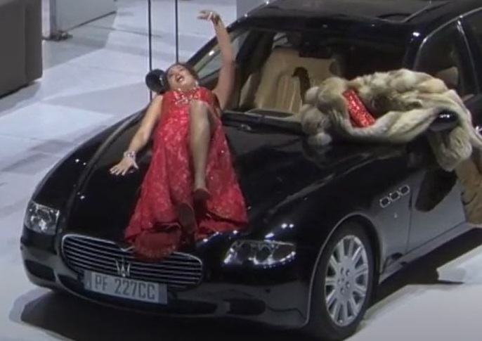 Хороший тенор, кстати. Костюмное решение чисто индивидуальное - другой тенор в той же постановке одет совсем по-другому. Стоящую на сцене Лянчу сменяет Мазератти, на капоте которой поёт Норина: