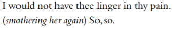 Поражает живучесть Дездемоны. Вопросы есть, согласен. Но тогда все эти красивые разговоры мавра насчет порчи прекрасного тела - пустая болтовня. Физиологически нельзя после удушения говорить, но в трагедии, видимо, все же можно. Если уж на то пошло, то после удушения с последующими кинжальными ударами, тоже много не наговоришь.