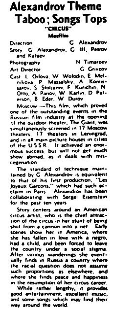 В 1936 году "Голливудский репортер" сообщал в рецензии "Цирка" - что фильм, конечно, пользуется громадным успехом, и вот это вот все. Но за рубежом особо его показывать не будут, т.к. он про смешение рас.