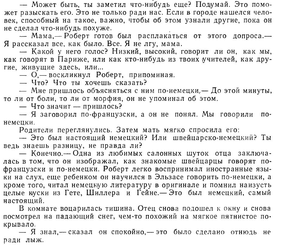 -- Конечно, знаю, о чем ты говоришь? -- обиделся Роберт. Одной из любимых забав отца перед гостями в Париже было подражание своим швейцарским друзьям. Вначале он говорил на французском, а потом переходил на швейцарский немецкий. У Роберта был тонкий слух и ему легко давались языки. Не говоря уже о том, что в детстве он постоянно слышал, как говорили на немецком его дедушка с бабушкой, выходцы из Эльзаса, в школе он изучал немецкую литературу, знал наизусть большие отрывки из произведений Гете, Шиллера и Гейне.-- Тот человек говорил на нормальном, хорошем немецком языке,-- сказал он.