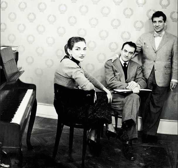 Мария Каллас, Лукино Висконти и Леонард Бернстайн, 1955. |