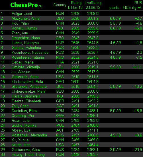 FIDE Women Grand Prix Kazan 2012 ( 11 rounds ) [ Hou Yifan, A. Muzychuk , Koneru Humpy, Lahno, T. Kosintseva, N. Kosintseva, Stefanova, Cmilyte, Galliamova, Danielian, Kosteniuk ]