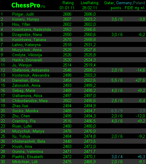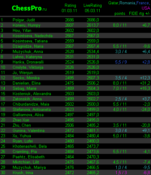 FIDE Women's Grand Prix - Doha, Qatar (11 rounds)[Koneru,Dzagnidze, Stefanova,Cramling Pia,Chiburdanidze,Zhu Chen,Sebag ,Xu Yuhua,Mkrtchian,Danielian ]