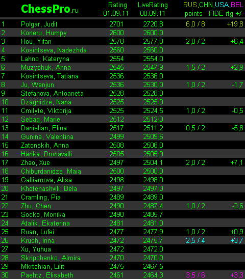 Women's Grand Prix Shenzhen (11 rounds) [ Hou Yifan, Muzychuk Anna, Ju Wenjun, Cmilyte, Danielian, Zhao Xue, Zhu Chen, Ruan Lufei, Munguntuul ]