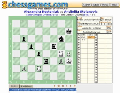 1. e4 e5 2. Nf3 d6 3. d4 f5 4. exf5 e4 5. Ng5 Bxf5 6. f3 exf3 7. Qxf3 Qe7+ 8. Kd1 Qf6 9. Qxb7 Qxd4+ 10. Bd3 Qg4+ 11. Nf3 Bxd3 12. cxd3 Ne7 13. Qxa8 Nec6 14. Qb7 Be7 15. Rg1 O-O 16. Be3 Kh8 17. Nbd2 d5 18. Rc1 Qg6 19. d4 Bb4 20. Ne5 Nxe5 21. Qxb4 Qg4+ 22. Nf3 Nbd7 23. h3 Qe4 24. Nxe5 c5 25. Qd2 cxd4 26. Qxd4 Nxe5 27. Qxe4 dxe4 28. Ke2 h6 29. Rc7 Nd3 30. Rf1 Rg8 31. Bd4 1-0