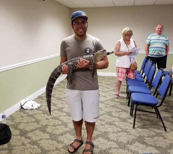 Неравные условия (красавчик не может дать интервью). У меня где-то была старая флоридская фотография, где полицейский перед туристами так же держал красавчика, так там красавчик тоже мог дать интервью.