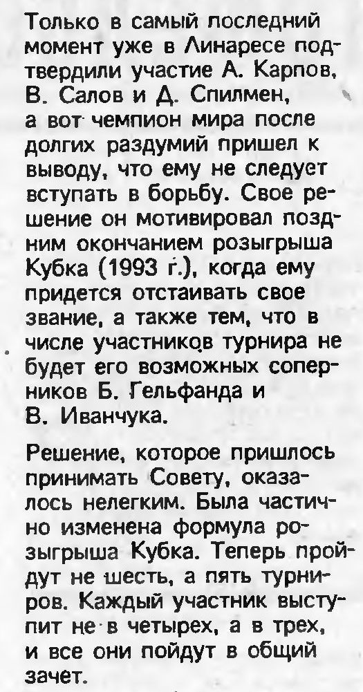 Снова у меня образовался длительный перерыв. Надеюсь, что в ноябре мои отношения с Интернетом наконец-то нормализуются.А сейчас сведения о демарше Каспарова.