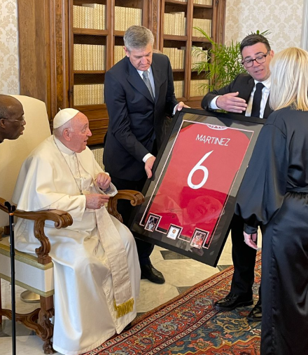 | Мэр Большого Манчестера Эндрю Бернем подарил понтифику футболку с подписью защитника «Манчестер Юнайтед» и сборной Аргентины во время аудиенции в Ватикане. |