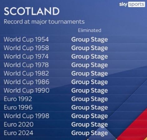 Сборная Шотландии никогда в своей истории не выходила из группы на крупном турнире – провалили все 12 попыток