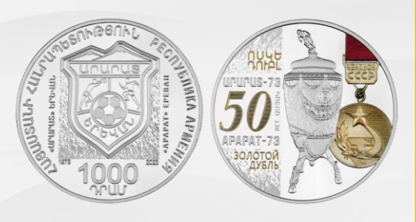 Центральный банк Армении ввел в обращение серебряную памятную монету, посвященную 50-летнему юбилею победы ереванского "Арарата" в чемпионате и Кубке СССР в 1973 году.