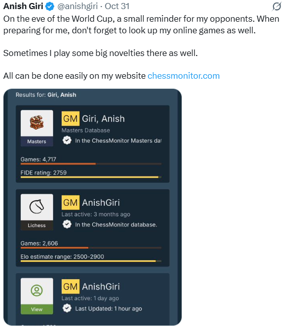 Гроссмейстер Аниш Гири объявил о приобретении ChessMonitor.com — платформы шахматной аналитики, которая позволяет анализировать все ваши партии в одном месте.