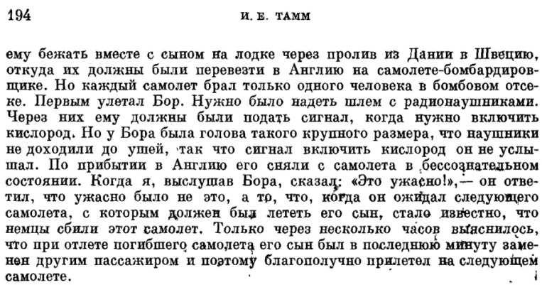 | Игорь Евгеньевич Тамм (в мемориальной речи 12 декабря 62-го года): …Когда я, выслушав Бора, сказал: «Это было ужасно!» — он ответил, что ужасно было не это, а то, что, когда он в Лондоне ожидал сведений о самолете, с которым должен был лететь его сын, стало известно, что немцы сбили тот самолет. Лишь через несколько часов выяснилось, что при отлете погибшего москито в последнюю минуту его сын был снят с борта и потому благополучно прилетел другим рейсом… Oгe Бор в своих воспоминаниях этой истории не рассказал. Ограничился четырьмя словами: «Я прибыл неделей позже». |
