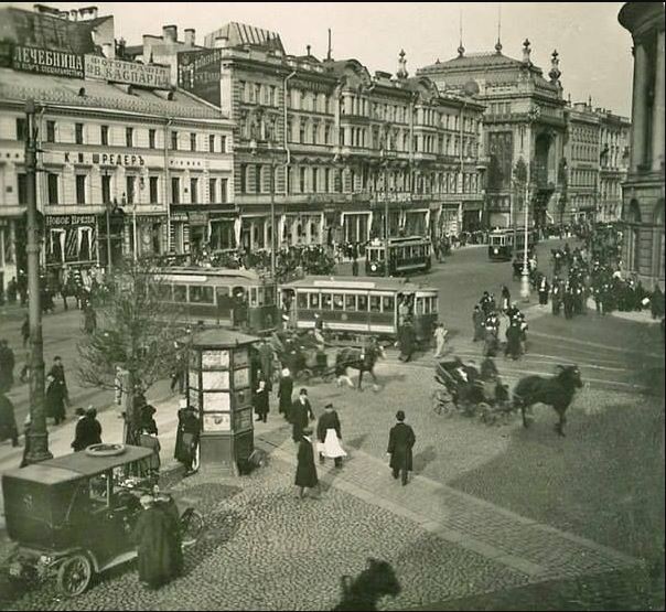 То, что трамваи по Невскому проспекту ходили до 1951 года известный факт. А извозчики ранее везде были, вспомнил: