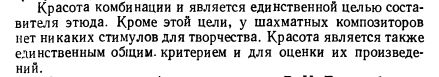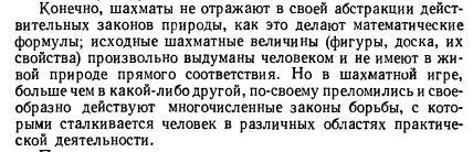 Во-вторых, по поводу красоты я не спорю. Красота, она и в Африке красота! Сомневаюсь только в тезисе, что в шахматах сильно отражаются реалии нашего мира. Раньше считалось, что шахматисты все поголовно толковые в жизни и превосходные математики. Теперь уже об этом не принято говорить. Взять,хотя бы, роман Набокова Защиту Лужина. Главный герой гениальный шахматист, а в практической жизни...