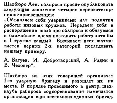 "Почему шахматное движение оказалось частью физкультурного движения? Это произошло не случайно. Мы сознательно пошли на это, исходя из чисто практических соображений. Мы считали, что формы физкультурного движения и физкультурных организаций как нельзя более подходят для построения шахматной организации. В самом деле, и здесь и там мы имеем сейчас стройную организацию, начиная с низового кружка на предприятии и кончая высшими руководящими центрами; и там и здесь мы имеем командные встречи, массовые соревнования и чемпионаты, завершающиеся таким крупнейшим состязанием, как чемпионат СССР. Как будто, сходство полное, но это сходство только внешнее. Если шахматисты в силу объективных, исторических обстоятельств оказались физкультурниками, то значит ли это, что мы считаем шахматы спортом — и только? Нет, не значит. Значит ли это, что принципы и методы работы физкультурных организаций могут быть безоговорочно перенесены в организации шахматные? Нет, не значит."