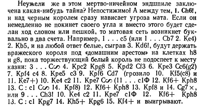 Неужели же в этом характернейшем мертво-ничейном эндшпиле заключена какая-нибудь комбинационная тайна? Непостижимо!” (А. Гурвич "Шахматная поэзия" в сб. Советский шахматный этюд, М., 1995 г., стр. 31-32)