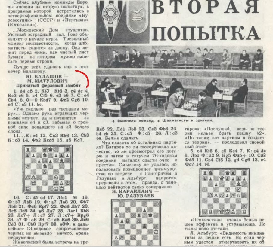 Сообщение Малкина похоже на правду. Примерно о том же говорит "64" #3/79, который приводит партию Балашов-Матулович. Правда, журнал ее обрывает в момент, когда белые провели ферзя, и пишет: "и дальнейшее 13-ходовое сопротивление черных не вызвало ничего, кроме недоумения".