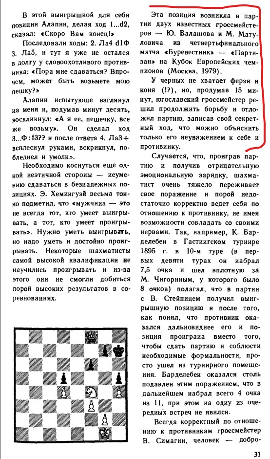 Недавно пролистывал книгу Эстрина "Теория и практика шахматной игры" (2-е издание, 1984 год). В самом начале книги есть 2 статьи доктора медицинских наук В.Б.Малкина. Одна из статей называется: "Проблемы психологической и физической подготовки шахматиста" и там затронута тема "неумения сдаваться в безнадёжных позициях" и в качестве примера приведена партия Балашова и Матуловича (см. вложение). Это мне показалось крайне странным - я не поверил, что Матулович мог отложить партию в такой позиции.