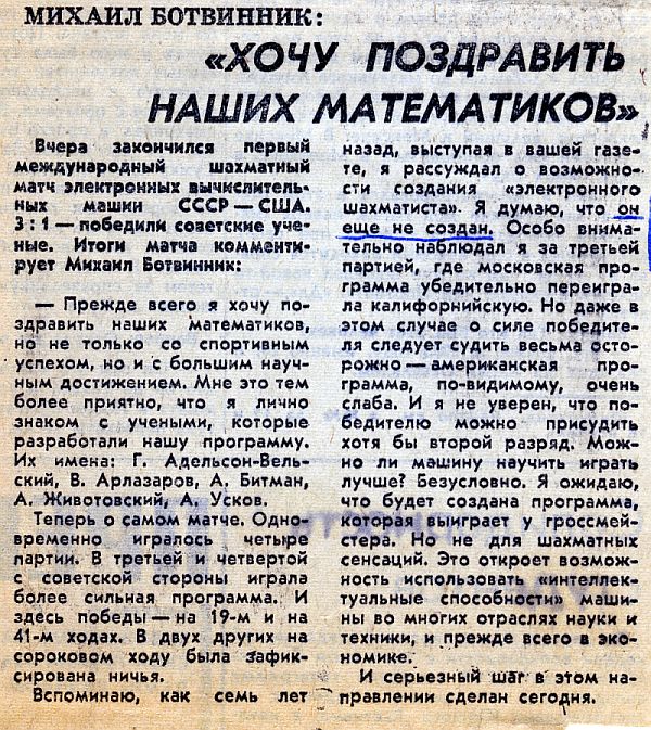 С "Первой книгой шахматиста" смешно получилось. Она появилась в продаже примерно весной 1964 года и была мне нафиг не нужна, т.к. у меня был уже 3 разряд. Но в начале июня мы с классом ездили на 10 дней в Москву и моя будущая соседка по парте, Валя Ботвинник, племянница самого ММБ(её мама сестра ММ по отцу), позвонила ему и он обещал приехать. Я решил взять автограф и побежал искать какую-нибудь шахматную прессу, но как назло нигде ничего не было, ни " Шахматы в СССР", ни моих любимых рижских(талевских) "Шахмат". И вот о чудо - в одном газетном киоске лежала "Первая книга шахматиста". Пришлось купить абсолютно ненужную мне книгу. Могла бы пригодиться потомкам, моим или брата, но к сожалению никто из наших детей или внуков шахматами не заинтересовались... ММБ приехал утром, привез несколько больших пакетов(2-3 кг) хороших шоколадных конфет разных сортов для всех нас, был немногословен, спокойно и без всяких эмоций дал мне автограф и съездил с нами на Новодевичье кладбище. Для нас это была экскурсия, а у них(Ботвинников) был там кто-то похоронен.