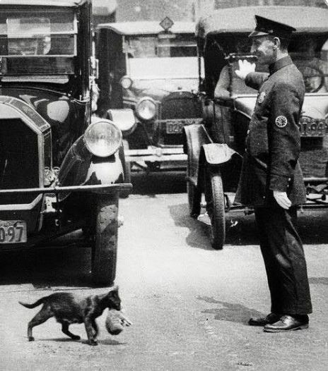 Picture taken circa 1925 when a NYC policeman stopped traffic to allow a mama cat and her baby to cross the street. |