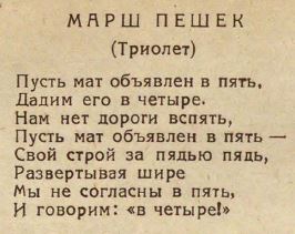 Все-таки, в этом триолете смысла маловато. Форма выдержана, тема шахматная, но мысль странная. Мат объявлен в 5 ходов, а мы несмотря ни на что в 4 его сделаем. Будем игнорировать правила и дадим мат раньше. Интересно каким способом. Остапобендеровщина.