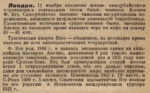 | Имя вышеупомянутого шахматиста Frederick Yatse, по-русски должно быть Ейтс или Йейтс. В википедии написано что он отравился во сне от утечки светильного газа. В русской Вике указывается также версия о самоубийстве, в английской Вике упоминания об этом нет. |