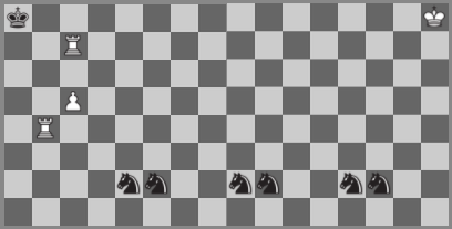 Задача на цугцванг, у черных оба коня играют вовсю, и в зависимости от того, какой и куда идет, вторая ладья становится на одно из четырех полей ослабленной четвертой горизонтали. Нет, это совсем не "задача одного хода" |