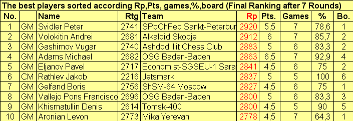 | Обнаружил, что в мужской части тоже играла команда из Монако, причем (внимание!) сильнейший по рейтингу Ефимов уступает слабейшей по этому же показателю в женской команде Скрипченко15 пунктов! |