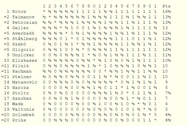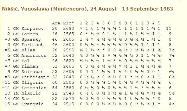 В первом туре победил черными, затем стриктно следовал графику - победа белыми, короткая ничья черными (соответствено в 13,13 и 9 ходов). С тех кто за ним, сыграл только против Кинтероса и Панно.И етого хватило для единоличной победы, вот ето талант!