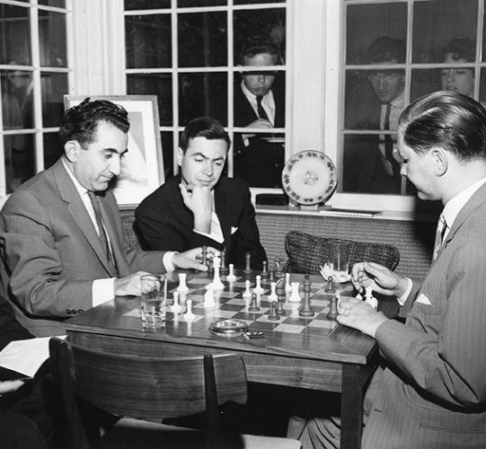 Тигран Петросян анализирует партию вместе с Паулем Кересом, а Оскар Пanno наблюдает.