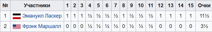 Позже доктор Ласкер согласился сыграть с Маршаллом на чемпионате мира, который должен был состояться в Нью-Йорке, Филадельфии, Вашингтоне, округ Колумбия, Балтиморе, Чикаго и Мемфисе.