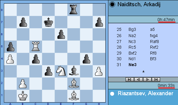 Игра на цейтноте противника:"Автогол Рязанцева" случился 32.Be1? (32.Bg1! +-).