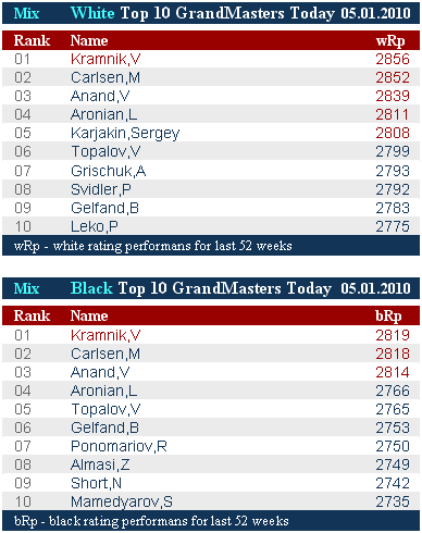 Но предполагал, что черным цветом он пропустит вперед «черного» Карлсена и очень хорошего «черного» Ананда, однако результат виден в таблице «черной десятки» – Крамник лидер, черный цвет Крамника по сумме всех сыгранных партий за последние 52 недели сильнейший