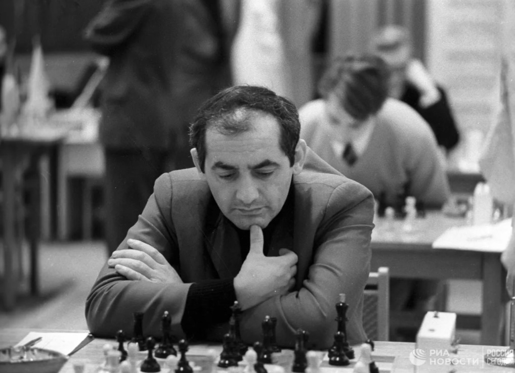| Efim Geller vs Mikhail Tal. Anatoly Karpov, Tigran Petrosian, Alexander Roshal and Semyon Furman next to them. |
