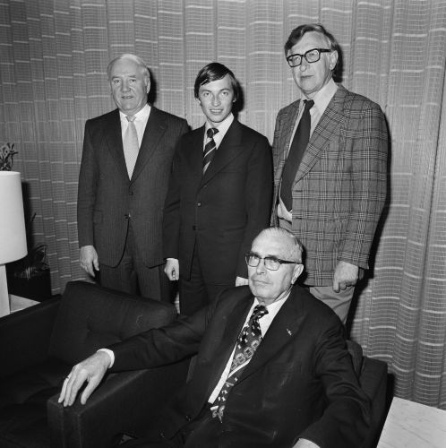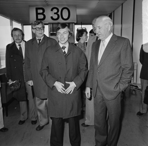 | 21 сентября 1977 года. Советских представителей на первом супертурнире «Интерполис» в Тилбурге — Анатолия Карпова, Василия Смыслова и Юрия Балашова — по прибытии в аэропорт Схипхол встречает Макс Эйве. |