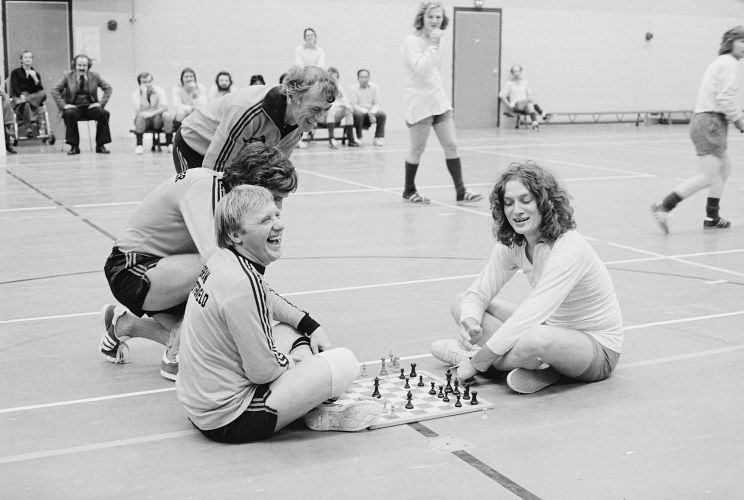 | В выходной день перед последним туром (к тому же в день рождения участника Фридрика Олафссона) шахматисты турнира Хугованс — #TataSteelChess 1977 — сыграли футбольный матч против голландских артистов. Это не прервало победную серию Тиммана — 5 из 5 на финише! |