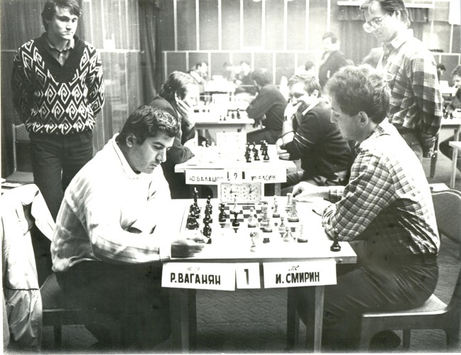 - Но тем не менее зал был полон – несколько сотен зрителей, действительно было интересно играть! Абсолютно неординарное соревнование. Карпов, Каспаров… И сейчас это было бы что-то из ряда вон выходящее, а уж тогда и подавно. Я начал хорошо, имел 2,5 из 4-х. Помню сообщение в программе «Время». (А шахматы в спортивных новостях тогда стояли на первом плане, особенно если играли два «К». Прекрасно помню, что когда, например, шел их матч, начинали новости с него, а потом уже все остальное) И вот по телевизору передают: «В Москве проходит чемпионат СССР, после двух туров лидируют Каспаров и Смирин – по 1,5 очка». |