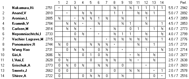 Накамуре предстоит очень тяжелый финиш. Ему ещё играть со всеми непосредственными претендентами на первое место, за исключением Ароняна, с которым он уже сыграл. |