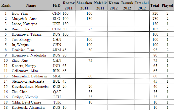 | Александра совсем расклеилась. Не удивлюсь, если она под каким-нибудь предлогом снимется с серии турниров Гран-При. Хотя там контракт... Но кто же в ФИДЕ смотрит в контракты? |