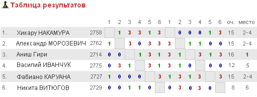 | Очень порадовала победа Иванчука. После гнетущей концовки его партии с Каруаной можно было предположить самое худшее. |